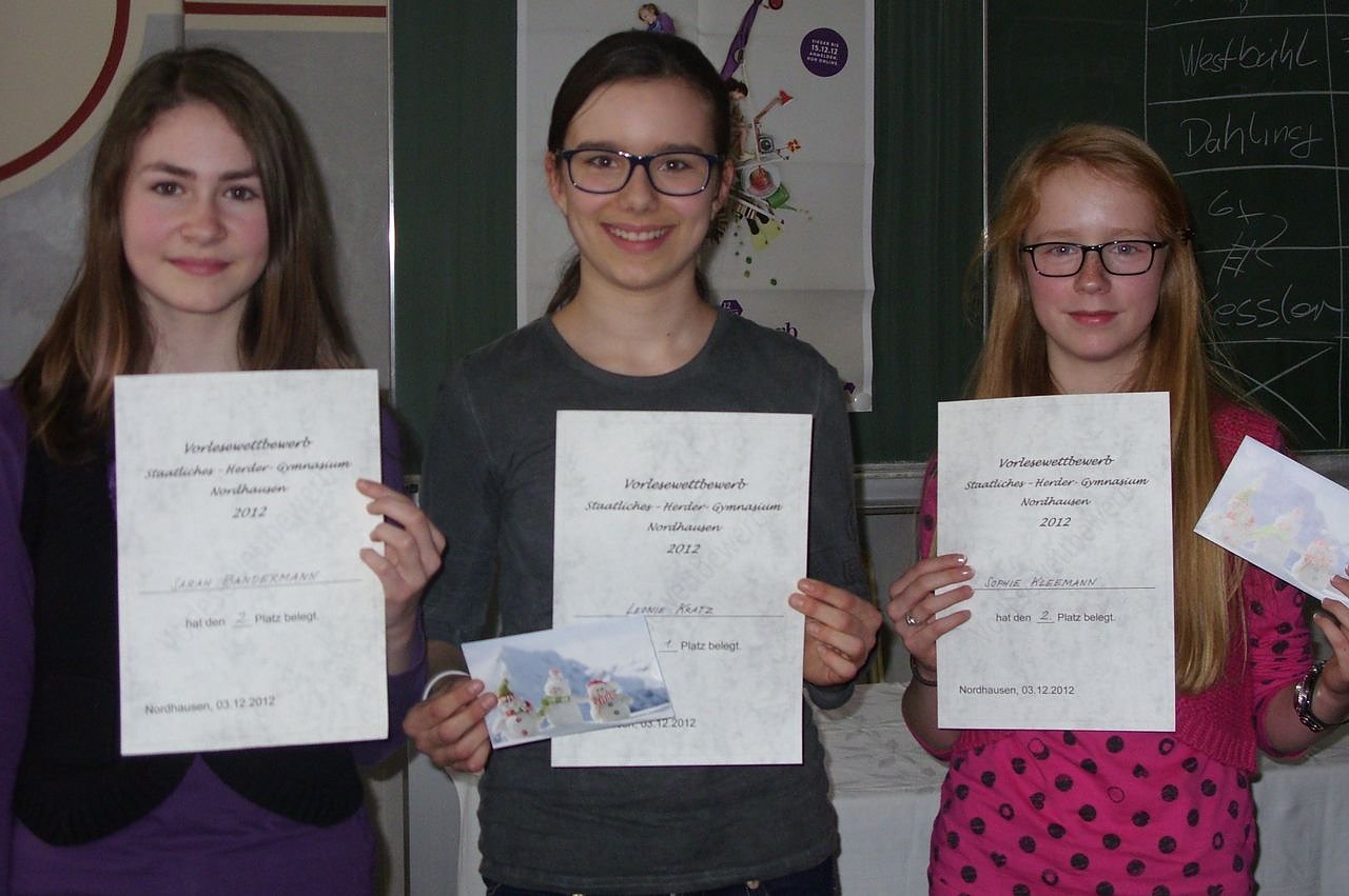Autor: redDie Siegerin des Lesewettbewerbs Leonie Kratz (m) mit den beiden Zweitplatzierten Sarah Bandermann (li) und Sophie Kleemann (re)