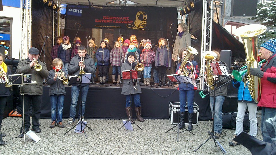 Pünktlich um 14 Uhr stimmten das Bleicheröder Posaunenorchester und der Chor der Grundschule die Anwesenden mit besinnlichen und bekannten Weihnachtsliedern ein. Der Marktplatz rund um den geschmückten Zierbrunnen füllte sich rasch.