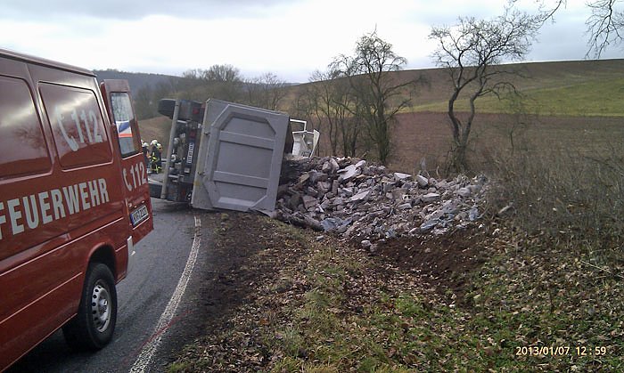 Das recht neue Fahrzeug, dass mit Bauschutt beladen war, kippt nach rechts in den Straßengraben. Durch den Aufprall wurden Zugmaschine und Fahrerhaus erheblich zerstört, die Ladung landete im Straßengraben. Der Fahrzeugführer musste durch die Rettungskräfte, Polizei, Feuerwehr und Sanitäter geborgen werden und kam schwer verletzt per Hubschrauber ins Krankenhaus. Im Einsatz waren zum Beispiel die Freiwilligen Feuerwehren aus Sondershausen-Mitte und Bebra. Nach Schätzungen der Polizei gab es einen Schaden in Höhe von rund 80.000 Euro.