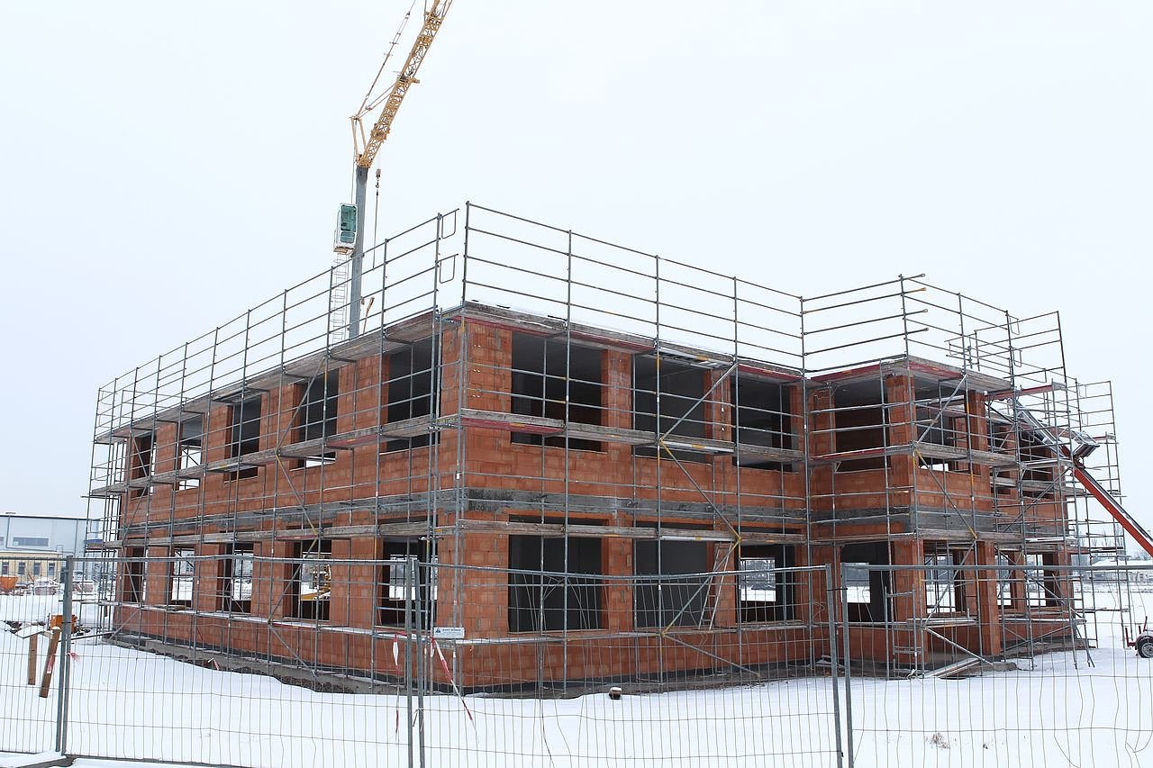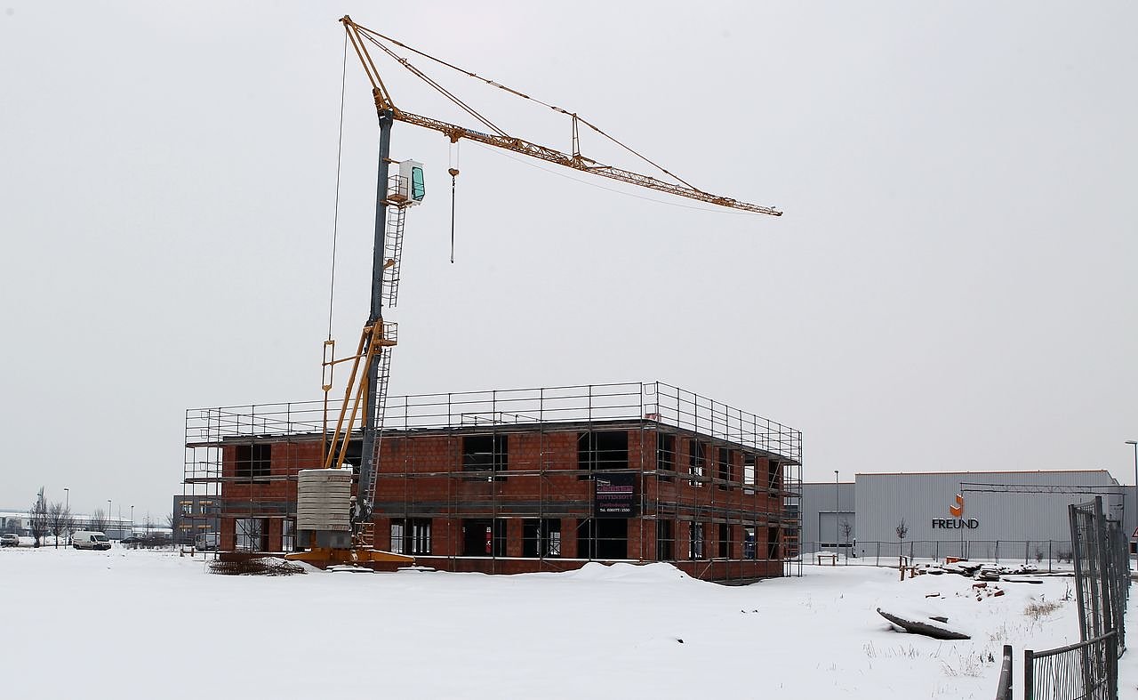 Befragt nach dem Stand seiner Investition im Gewerbegebiet an der Nordhäuser Darre, sagte Lüning, dass der Rohbau des Verwaltungstraktes - sozusagen der 1. Bauabschnitt - realisiert sei (Bild). In der zweiten Februarhälfte kommen die Fenster rein, zuvor, je nach Wetterlage, das Dach drauf und dann muss der Innenausbau starten.