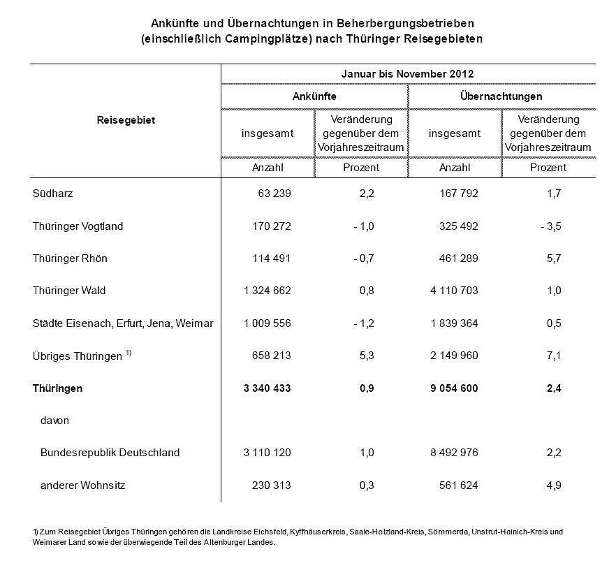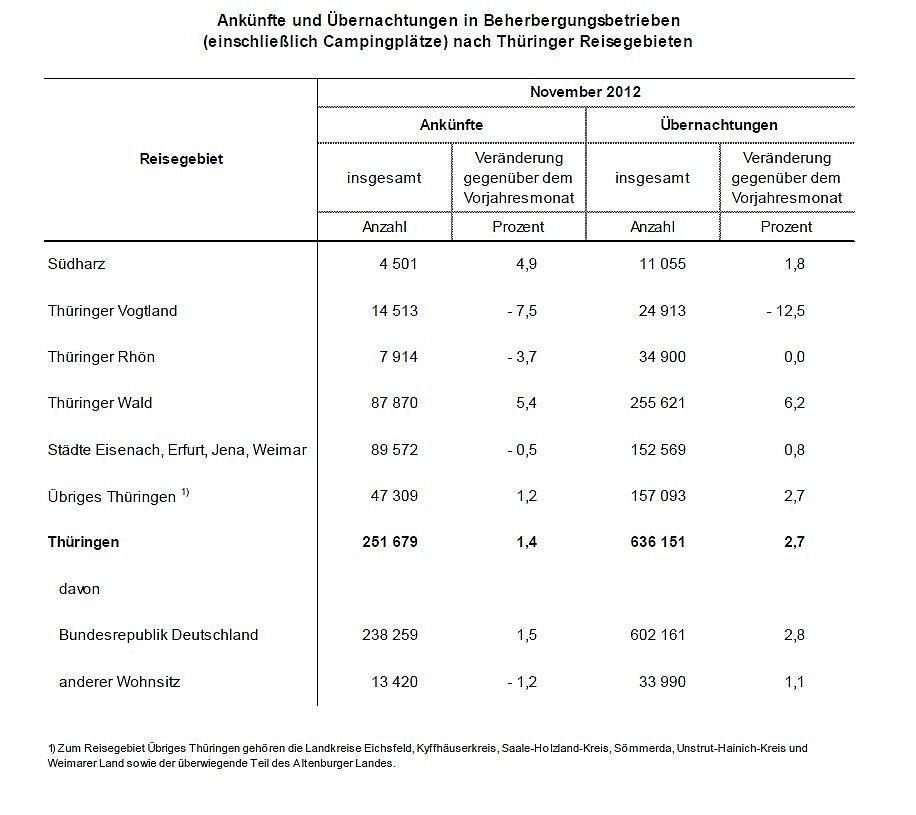 In Deutschland stieg die Zahl der Übernachtungen nach vorläufigen Ergebnissen des Statistischen Bundesamtes im Vergleich zum November 2011 um 3,0 Prozent auf 25,8 Millionen. Der Anstieg der Übernachtungszahlen und Gästeankünfte in Thüringen resultierte im November 2012 insbesondere daraus, dass im größten Thüringer Reisegebiet, dem Thüringer Wald, die Ergebnisse des Vorjahresmonats deutlich überboten wurden.