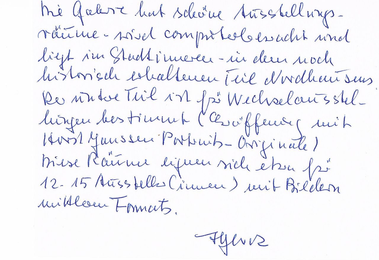 Die Schrift der Ilsetraut Glock zeigt auf eindrucksvolle Weise ihren Schwung und ihre Aufgeschlossenheit. Als Beispiel soll hier ein Schriftstück stehen, auf dem sie die Kunstgalerie in der Flohburg vorstellt, die ja zuerst als Kunsthaus gedacht war: Die Galerie hat schöne Ausstellungsräume – wird computerbewacht und liegt im Stadtinneren - in dem noch historisch erhaltenen Teil Nordhausens. Der untere Teil ist für Wechselausstellungen bestimmt (Eröffnung mit Horst Janssen Portraits - Originale) …