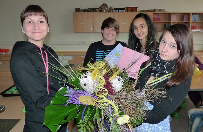 Autor: khhEinen riesigen Blumenstrauß gab es heute von den Schülerinnen und Schülern der Klasse 7b der Regelschule "Johann-Karl-Wezel", oder kürzer bekannt als Östertalschule, an Antje Langner. Sie hatte ihre Referendarzeit von zwei Jahren hier an der Östertalschule abgeleistet. Die Schülerinnen und Schülern sagten dankte und wünschten ihr alles gute in der weiteren Arbeit.