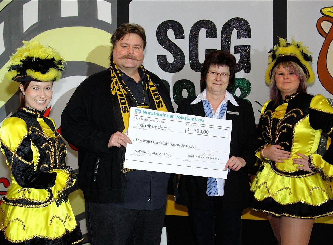 Autor: nnzHannelore Rys, Filialleiterin der Sollstedter Zweigstelle, übergab am Samstag einen Scheck an den Vereinspräsidenten der SCG, Michael Dommrich. Alle Narren bedanken sich mit einem Sollstedt "Tsching Bum".