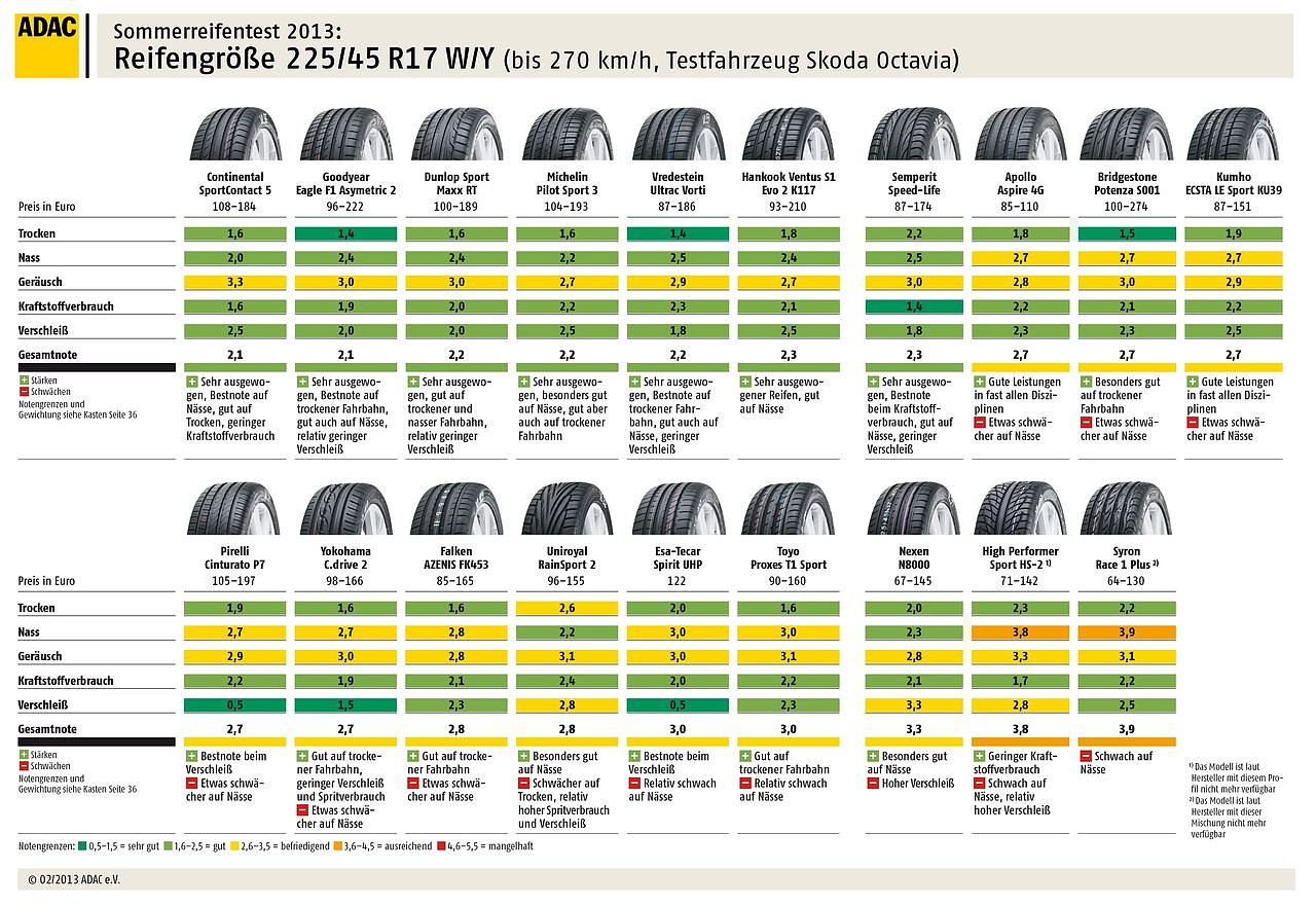 In der großen Dimension 225/45 R17 (z.B. für Audi A3, Mercedes C-Klasse, 3er BMW, Opel Astra oder Skoda Octavia) erreichen sieben von 19 Reifen die Gesamtnote gut und sind daher besonders empfehlenswert. Zehn erreichen ein befriedigend, zwei sind ausreichend – durchgefallen ist in dieser Größe kein Modell. Zu den Top Five zählen die ausgewogenen Pneus Continental SportContact 5 (Bester bei Nässe), Goodyear Eagle F1 Asymetric 2 (sehr gut auf trockener Fahrbahn), Dunlop Sport Maxx RT, Michelin Pilot Sport 3 und Vredestein Ultrac Vorti. Spritspar-Sieger ist der Semperit Speed-Life.