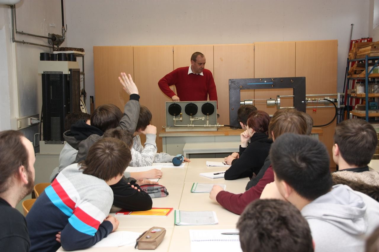 Zu den Fotos: Um in der Wirtschaft Qualität sichern zu können, bedarf es einer fundierten Ausbildung im neu eingerichteten Materialprüflabor. Der Ständige Vertreter des Schulleiters, Mathias Wiegleb bestimmt gemeinsam mit Schülern der FO 11 Technik im Labor das Spannungsdehnungsdiagramm für Betonstahl.