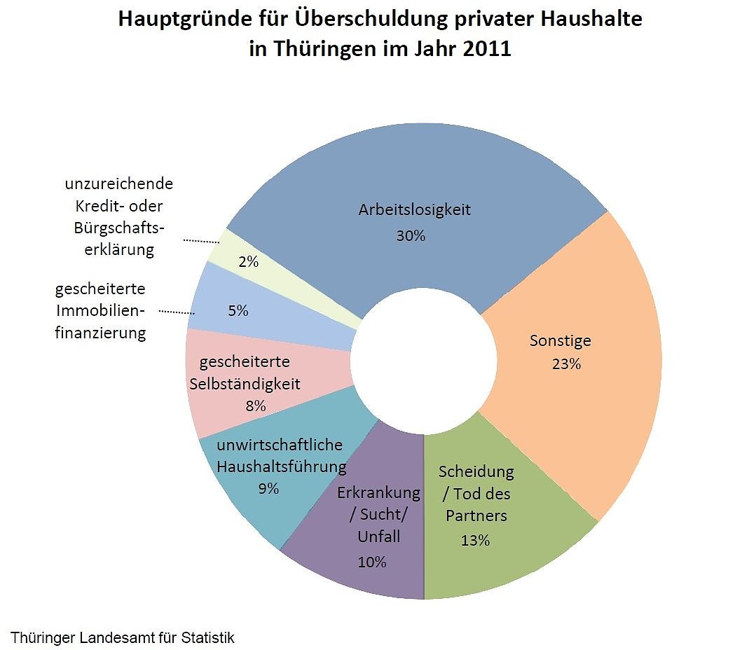 Wer über kein geregeltes Einkommen verfügt oder einen unvorhersehbaren finanziellen Einbruch erlebt, kann so recht schnell in die Mühlen von Banken und Inkassobüros geraten. Der häufigste Auslöser für die private Überschuldung war in Thüringen im Jahr 2011 die Arbeitslosigkeit. Nach Mitteilung des Thüringer Landesamtes für Statistik gab knapp ein Drittel der Betroffenen den Verlust des Arbeitsplatzes als Hauptgrund für ihre Überschuldung an. Aber auch Trennung, Scheidung oder Tod des Partners (13 Prozent), Erkrankung, Sucht oder Unfall (10 Prozent) und unwirtschaftliche Haushaltsführung (9 Prozent) sind nicht selten ausschlaggebend für die finanzielle Not.