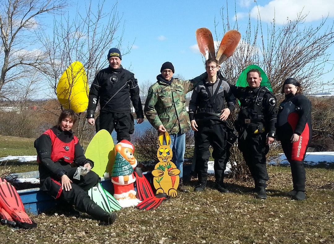 Wurde doch vermutet das der Osterhase das ein oder andere Osternest an der Uferzone der am Sonntag noch teilweise gefrorenen Wasseroberfläche versteckt hat. Gäste und Taucher wurden Mit Heißgetränken versorgt.
