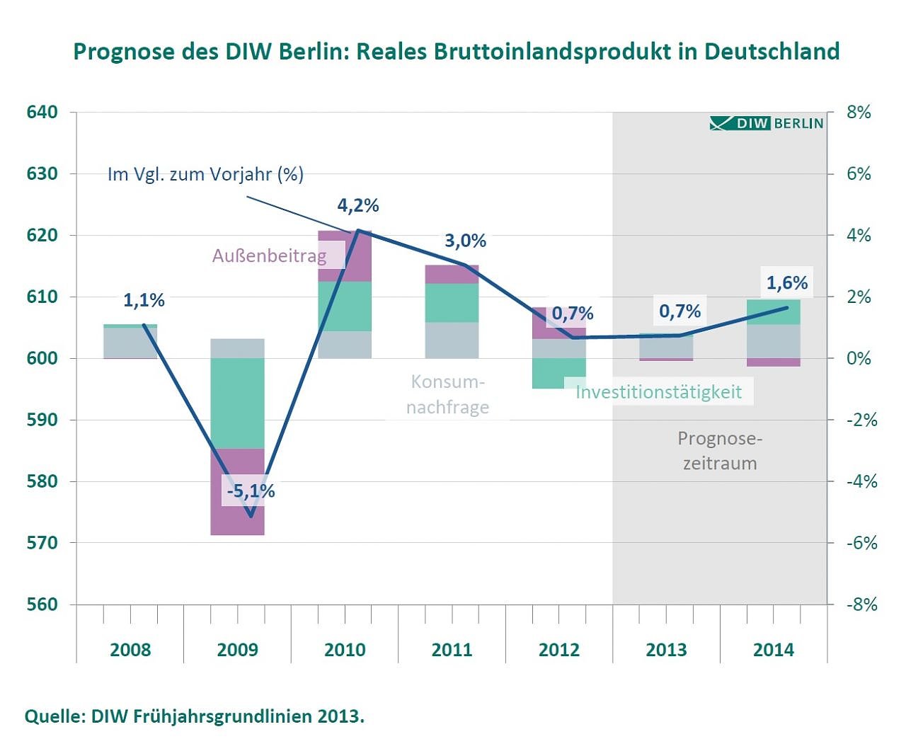 Nach einem schwachen Jahresausklang nimmt die deutsche Wirtschaft wieder Fahrt auf: Das Bruttoinlandsprodukt wird in diesem Jahr um 0,7 Prozent steigen, im kommenden Jahr ist dann ein Wachstum von 1,6 Prozent möglich. Das prognostiziert das Deutsche Institut für Wirtschaftsforschung (DIW Berlin) in seinen Frühjahrsgrundlinien 2013...