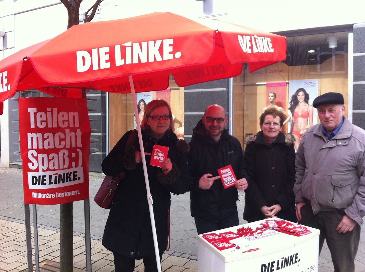 Große Vermögen sollen deshalb aus Sicht der Linken angemessen an den Aufgaben des Gemeinwesens beteiligt werden. Diese Zusammenhänge erläuterten die Aktiven des linken Stadtverbandes an ihrem Infostand und sammelten zahlreiche Unterschriften für den Aufruf des von Gewerkschaften und Verbänden getragenen Umfairteilen-Bündnisses. Diese sollen in der Hochphase des Bundestagswahlkampfes an die Spitzenkandidaten aller Parteien übergeben werden.