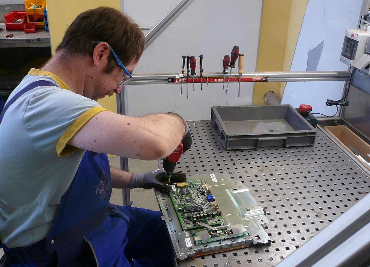Nun können die Mitarbeiter bei den Nordthüringer Werkstätten an zwei speziellen Arbeitsplätzen, die mit Filtersystemen ausgerüstet sind, ausgediente Flachbildfernseher und -monitore manuell demontieren. Die Arbeitsplätze sind zudem kabinenartig gestaltet und mit Absaugvorrichtungen versehen. Dies ist aus arbeitsschutztechnischen Gründen erforderlich, weil Flachbildgeräte Schadstoffe, wie zum Beispiel quecksilberhaltige Beleuchtungselemente enthalten, die bei der Demontage unter Umständen austreten können.