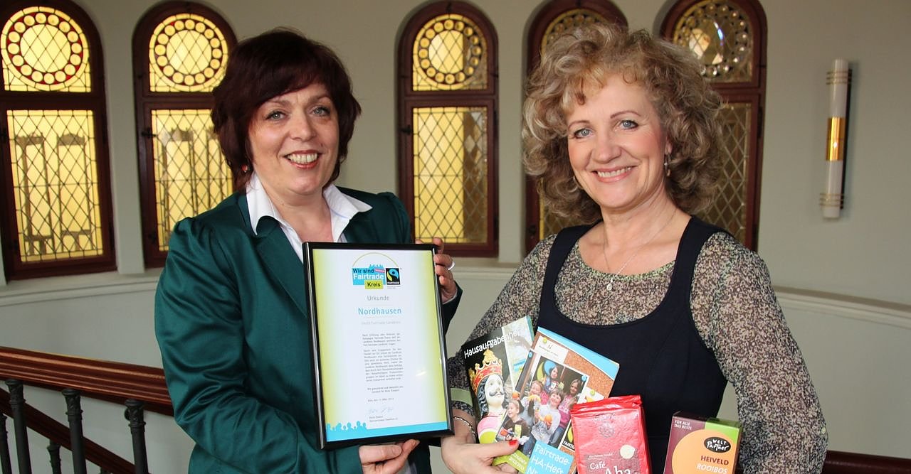 Gabriela Sennecke, die Leiterin der Steuerungsgruppe Fairtrade von Stadt und Landkreis Nordhausen, überreichte Landrätin Birgit Keller die Auszeichnungsurkunde des Vereins TransFair. Für vier Jahre darf der Landkreis Nordhausen damit den Titel Fairtrade-Town tragen. Gewürdigt werden damit die gemeinsamen Aktionen der Steuerungsgruppe Fairtrade, in der sich neben Stadt und Landkreis weitere Akteure wie der Weltladen engagieren.