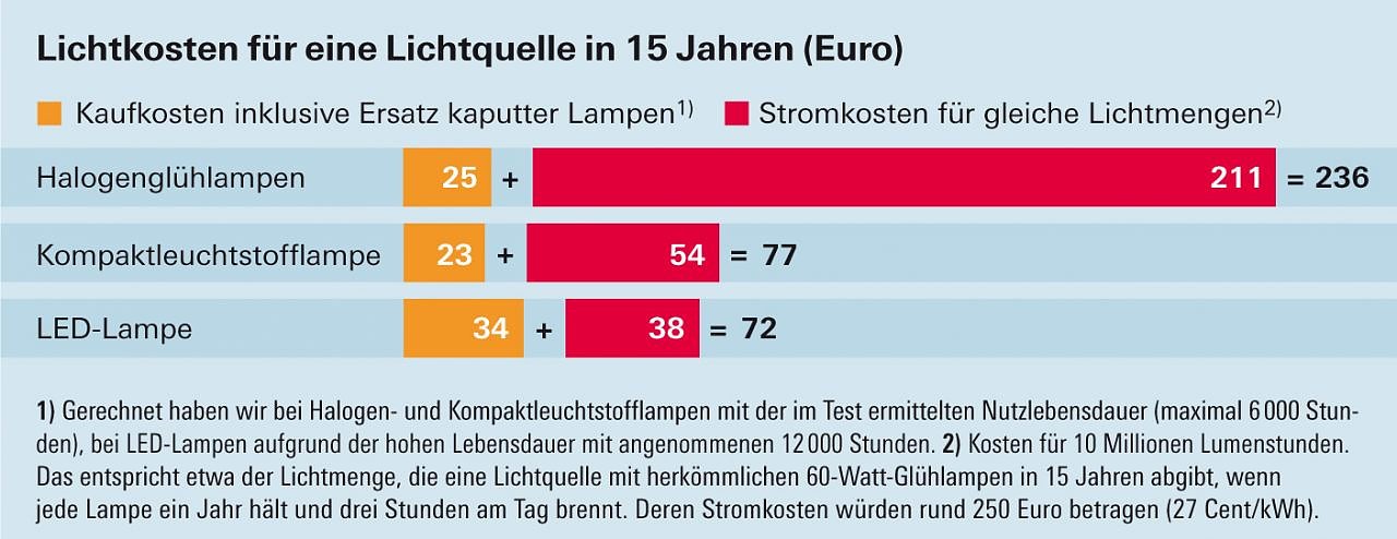 Auch hier sind LED-Lampen Spitzenreiter, so die Mai-Ausgabe der Zeitschrift test. Acht von neun LED-Lampen sind in diesem Prüfpunkt sehr gut oder gut. Gefolgt von den Kompaktleuchtstofflampen, die mit einer Ausnahme alle gut abschneiden. Deutliches Schlusslicht bilden die Halogenlampen. Ihr Umwelteinfluss ist drei- bis viermal größer als bei den anderen Lampenarten.