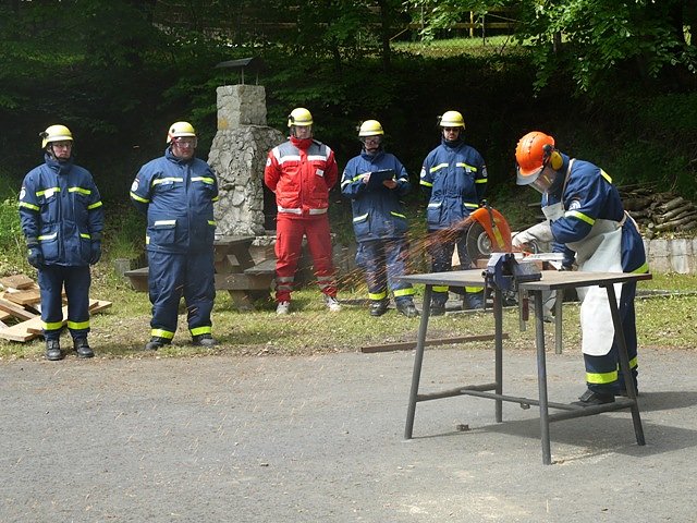 Eine Station war die Arbeit mit einem Trennschleifer, von der Bereitstellung des Arbeitsgerätes bis zum richtigen Umgang damit. Es musste auch darauf geachtet werden, dass an jeder Station ein Feuerlöscher stand. Eine nächste Station war das Ablöschen einer brennenden Person, wo mit einer Decke an einer Puppe gearbeitet wurde. Es war auch an den weiteren Stationen schon erstaunlich, was die Prüflinge alles können und wissen mussten. Fußpunktsicherungen bei Leitern, Anheben von Lasten, Aufstellen von Scheinwerfern, Zuordnen von Gefahrstoffen, was muss wie gelöscht werden, Arbeiten mit der Spreizschere und vieles mehr.