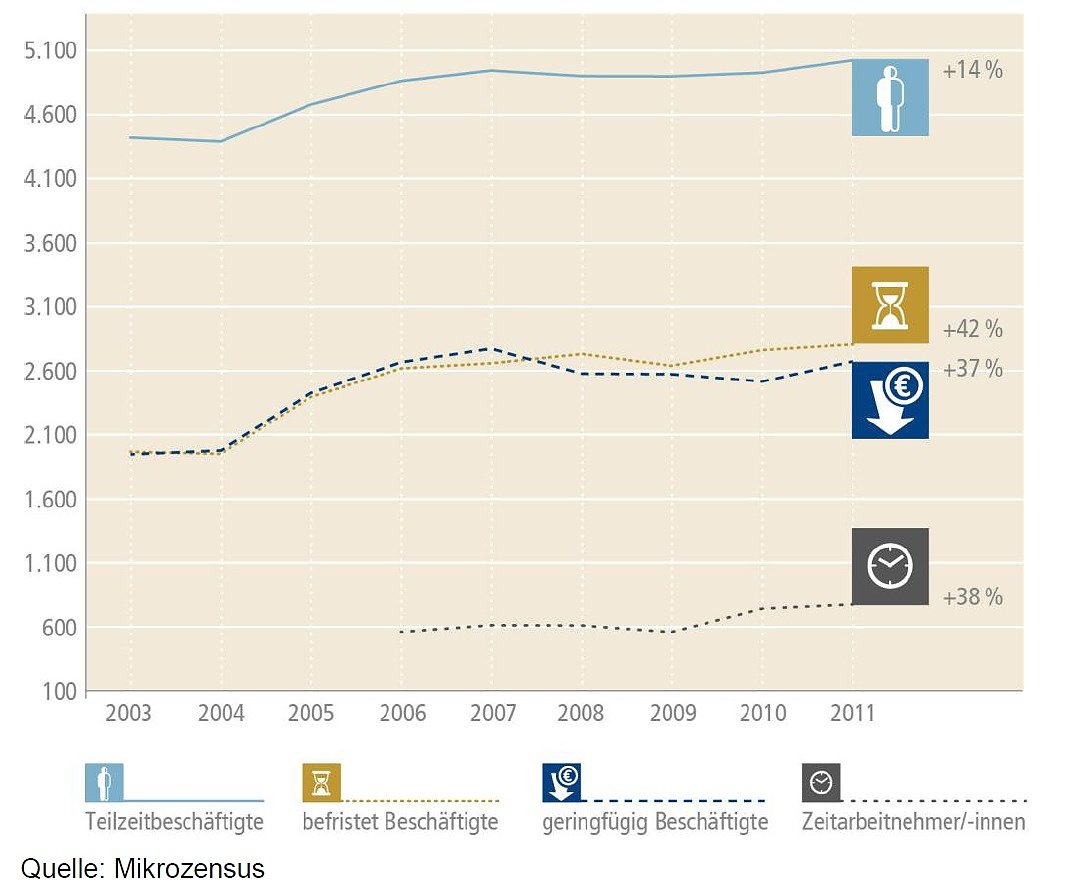 Unter den atypisch Beschäftigten haben die fünf Millionen Teilzeit- und die 2,8 Millionen befristet Beschäftigten die besten Aussichten auf berufliche Weiterbildung mit jeweils über 48 Prozent. Vor allem bei den befristeten Arbeitsverhältnissen stieg die Beteiligung an Weiterbildung; 2006 hatte sie noch bei 44 Prozent gelegen. Weniger Chancen auf Weiterbildung als die 775.000 Zeitarbeiter (27 Prozent) haben mit 23 Prozent nur noch die 2,7 Millionen geringfügig Beschäftigten (Mini-Jobber).