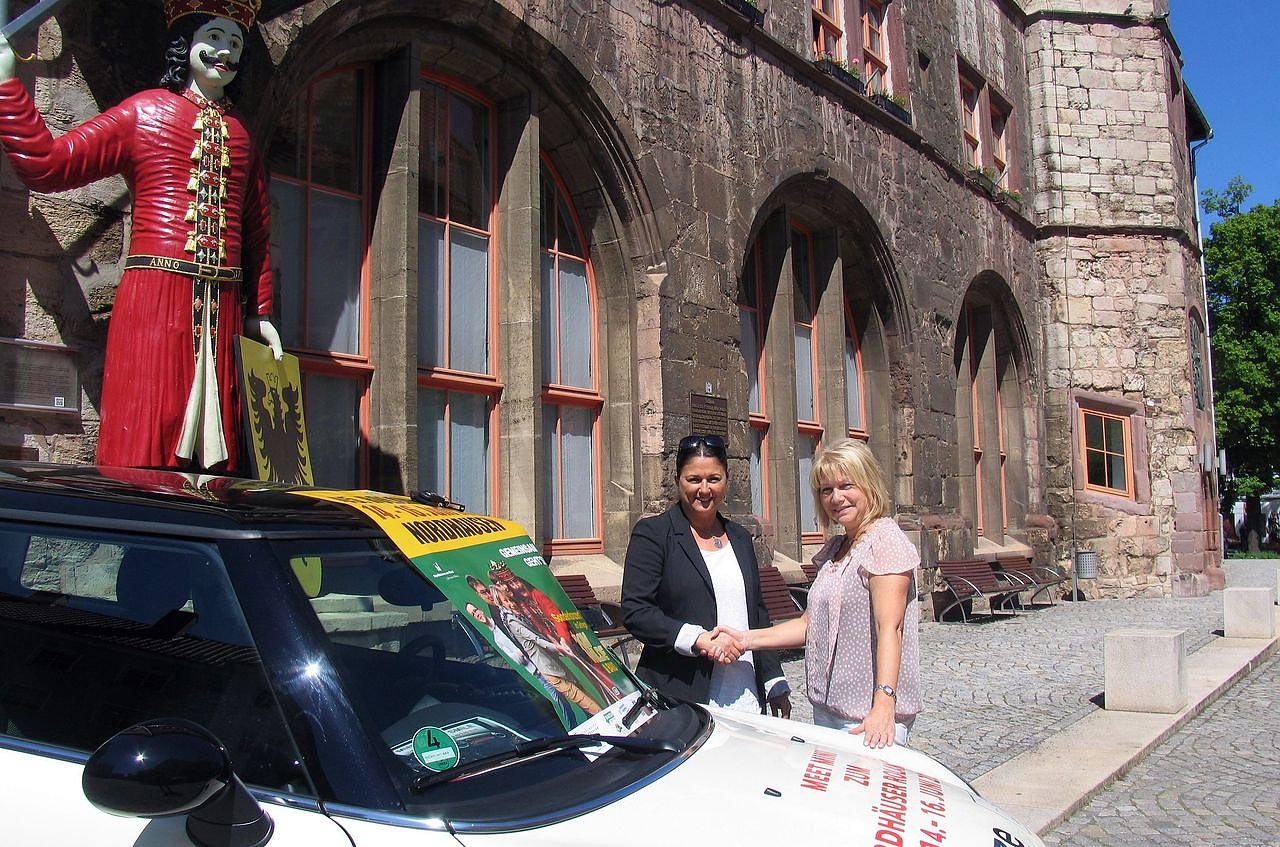 Geschäftsführerin Steffi Fritze (links), überreichte heute Kulturdezernentin Hannelore Haase den Zündschlüssel zu einem MINI der BMW Group. Damit ist unser Kulturamt flexibel in der Vorbereitung des Festes und ist außerdem auch zu den folgenden Rolandsfest-Feiertagen zur rechten Zeit am rechten Ort, freute sich Frau Haase.
