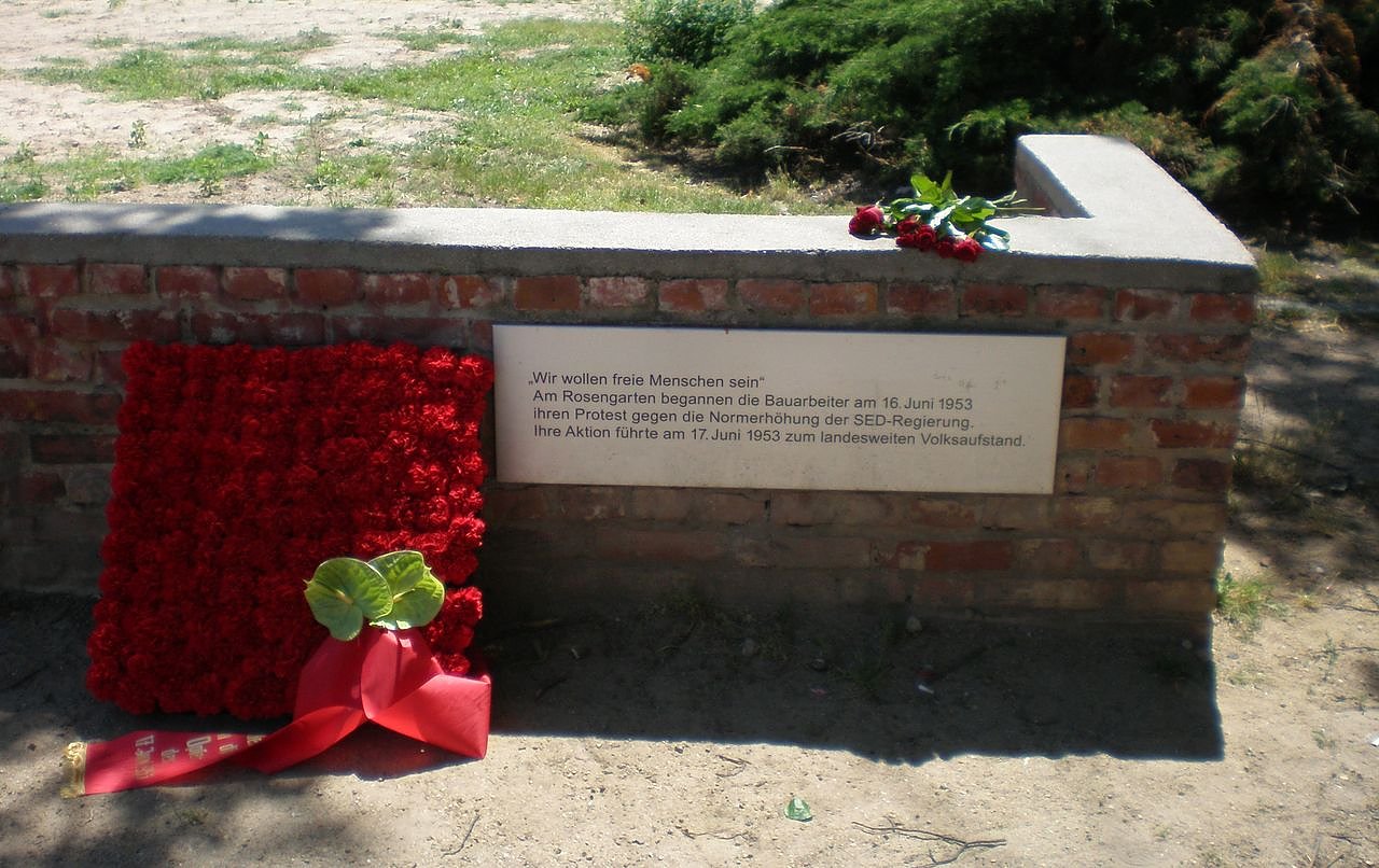 Vor der Feier legten Vertreter der IG BAU ein Blumengebinde am kaum auffallenden Denkmal in der Karl-Marx-Allee nieder und gedachten der Toten dieses Aufstands.
