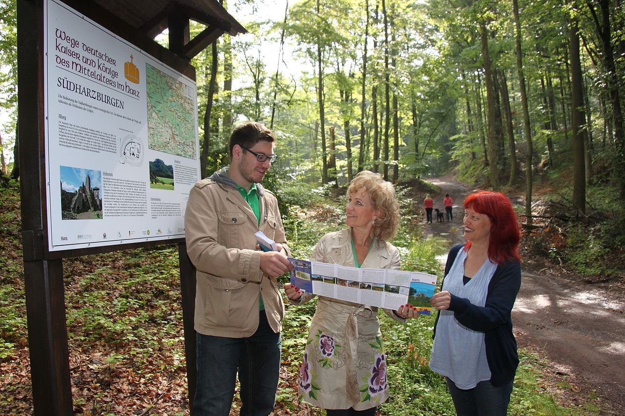 Um die Idee umzusetzen, gründete sich eine Arbeitsgruppe, die noch heute aktiv und eng vernetzt ist mit dem Harzklub. "Der Zahn der Zeit hat seine Spuren an den Tafeln und auch an Wegweisern hinterlassen", so Christiane Linke. "Eine Erneuerung war und ist an vielen Stellen notwendig." Der Regionalverband Harz als Träger der Naturparke Harz in Sachsen-Anhalt und Niedersachsen hat deshalb das Thema nun gemeinsam mit dem Naturpark Südharz aufgegriffen. "Mit dem heute vorgestellten Faltblatt wollen wir auch den Harztourismus fördern", sagt Christiane Linke.