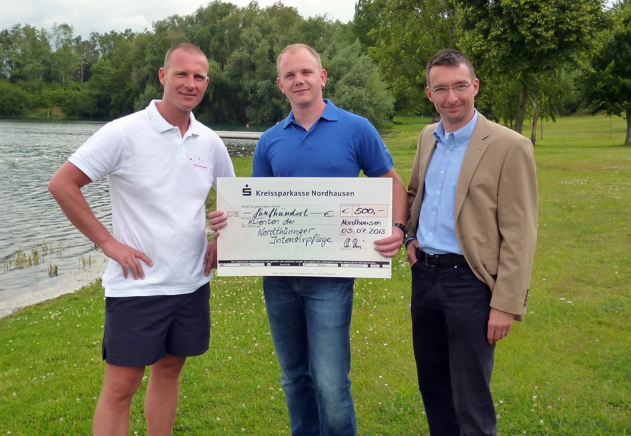 Fast alle Teilnehmer kamen ins Ziel zur Königspfalz in Tilleda und sie stockten am Ende den Spenden-betrag auf insgesamt 665 Euro auf. Die Spende nahm der Koordinator Heiko Beck in Vertretung der Klienten der Nordthüringer Intensivpflege entgegen. Auf Grund des großen Zuspruchs der Aktion sind sich Herr Döring und der Organisator Mario Windolf heute schon einig, dass 2014 noch einmal ein ganz besonderer Wandertag für den guten Zweck stattfinden soll.