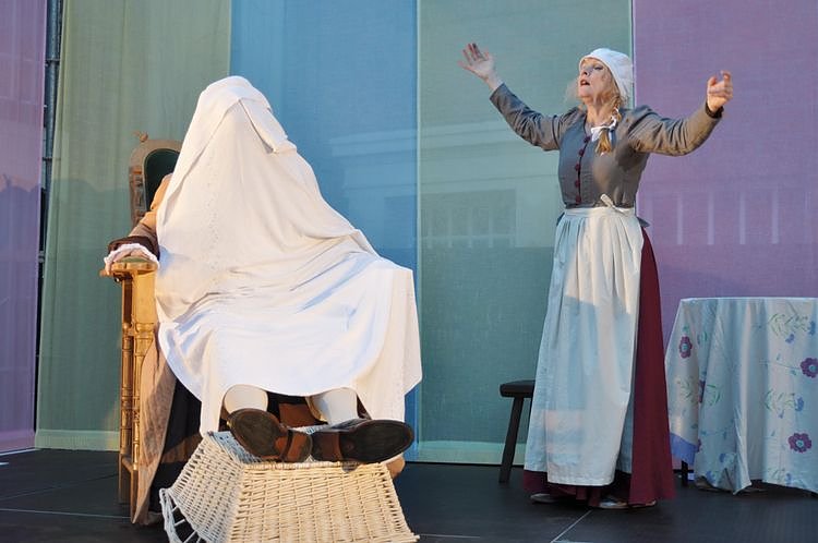 Mit allen Wassern gewaschen: Toinette (Cora Chilcott) überredet Argan (Günter Schoßböck - hier leicht verdeckt), sich tot zu stellen. Foto: Andreas Hillmann