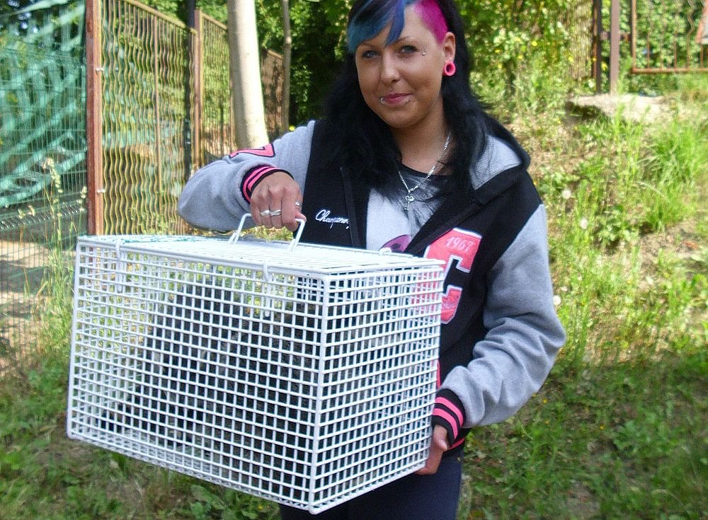 Hier sind die beiden noch gefangen. Praktikantin Kristin Ertmer mit dem Käfig