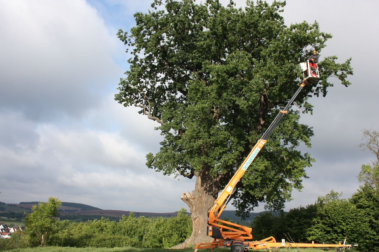 Die Pflegemaßnahmen führt die Landschafts- und Gartenbaufirma Becker aus, sagt Axel Axt, Baumschutzverantwortlicher der Stadtverwaltung. So erhält die alte Eiche neben einem leichten Pflegeschnitt, sechs neue Verspannseile in verschiedenen Bereichen der Krone. Sie sollen das Aufschwingen der Äste einschränken, um die Bruchgefahr zu mindern. Die drei alten Spannseile seien jetzt nach 10 Jahren verschließen, so dass man sie nun mit drei weiteren ersetzen müsse, erklärt er. Die Firma nimmt außerdem einige Kürzungen im Starkastbereich zur Gewichtsreduzierung der Äste vor und wird die alte Abbruchstelle aus dem Vorjahr sauber ausschneiden.