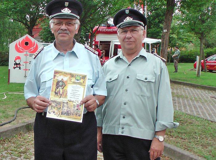 Dafür gab es jetzt vom Kreisfeuerwehrverband Sondershausen die goldene Ehrennadel für Reinhardt Winkler (li.), hier zusammen mit dem Vorsitzenden des Feuerwehrvereins Jecha, Achim Sickel.