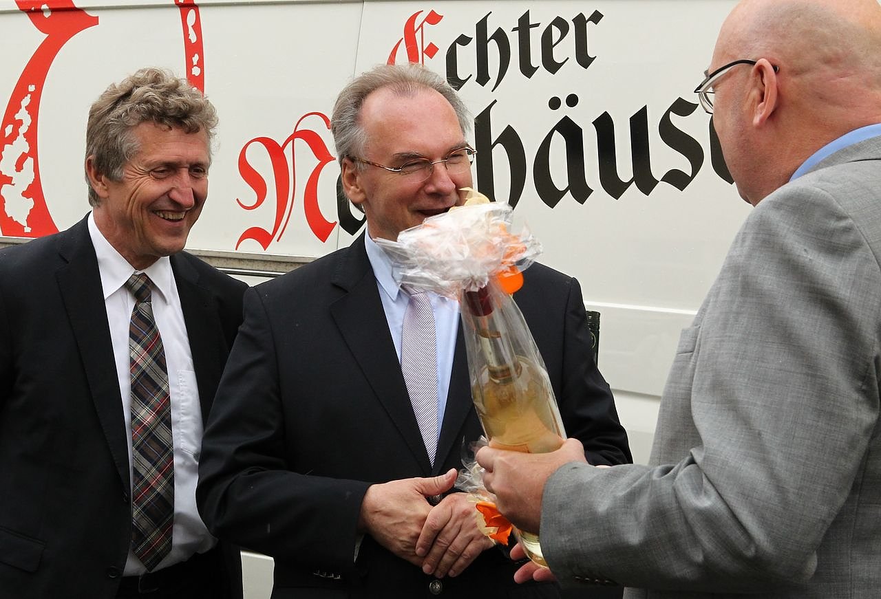 Haseloff berichtete der nnz, dass er gern die Einladungen sowohl des Unternehmens als auch von Oberbürgermeister Dr. Klaus Zeh angenommen habe. Es sei eine gute Verbindung zwischen Freyburg und Nordhausen, die Traditionsmarken und Arbeitsplätze gleichermaßen erhalte. Gegenstand der politischen Gespräche waren die weiteren Aktivitäten bei der Ausgestaltung der Luther-Dekade und die weitere gemeinsame Ausrichtung der Harzer Schmalspurbahnen.