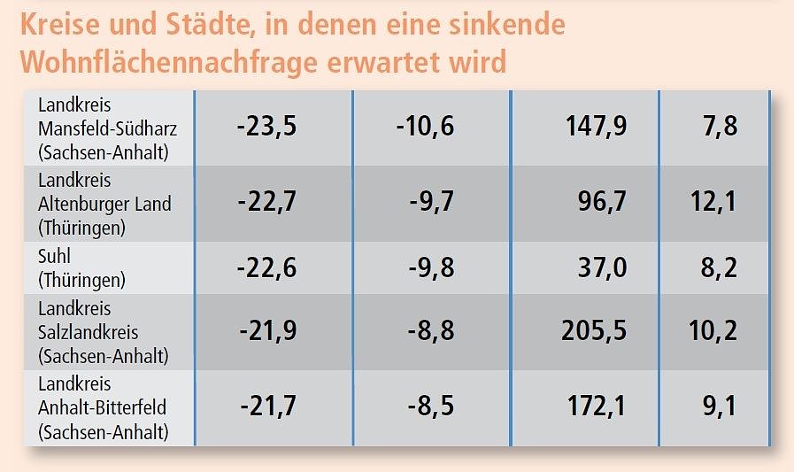Die IW-Wissenschaftler haben für ihre Analyse die Nachfrage nach Wohnfläche für alle 402 Landkreise und kreisfreien Städte vorausberechnet. In verschiedenen Szenarien haben die Wissenschaftler unter anderem berücksichtigt, dass sich der Pro-Kopf-Bedarf an Wohnraum unterschiedlich entwickeln könnte. Im Szenario mit konstantem Pro-Kopf-Bedarf ginge schon bis zum Jahr 2030 die Nachfrage nach Wohnraum in 240 der 402 Landkreise und kreisfreien Städte zurück.