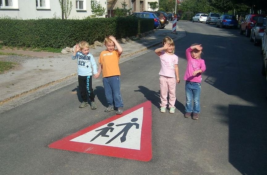 Dieses Zeichen kommt dort zum Einsatz, wo häufig Kinder auf die Straße laufen. Auch Ortsbürgermeister Hein Peter freut sich: Nun kann jeder Autofahrer erkennen: Hier ist unserer Kindergarten. Vorsicht und wenig Gas!