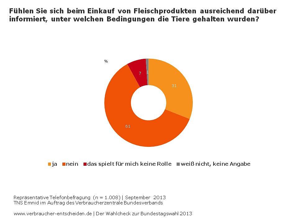 61 Prozent der Verbraucher fühlen sich beim Einkauf von Fleischprodukten nicht ausreichend darüber informiert, unter welchen Bedingungen die Tiere gehalten wurden. Das zeigt eine aktuelle Umfrage im Auftrag des Verbraucherzentrale Bundesverbands (vzbv), die TNS Emnid im Rahmen des Wahlchecks www.verbraucher-entscheiden.de durchgeführt hat...