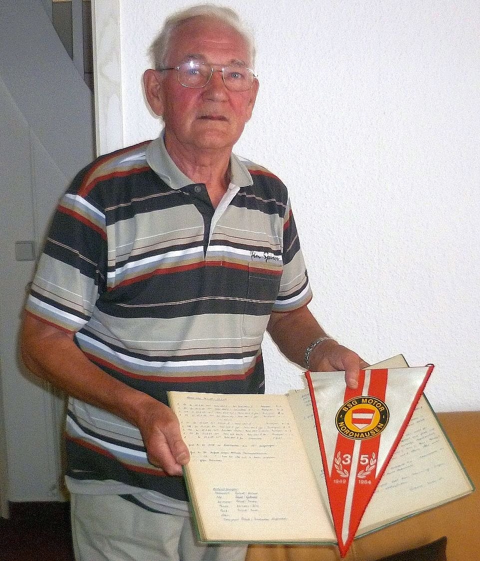 Er hatte im Laufe von Jahrzehnten einiges aufgestaut. Rotzoll, der als Technischer Leiter über dreißig Jahre in den IFA Motorenwerken Nordhausen arbeitete, kam gar nicht umhin, in dieser Funktion beim damaligen Trägerbetrieb auch für die BSG Motor Nordhausen West zu wirken. Lange Zeit bemühte er sich gemeinsam mit Herbert Beykirch, dem Vorsitzenden der BSG, die Sektion Fußball zu unterstützen.Als Mannschaftsleiter hatte Rotzoll engen Kontakt zu den Spielern und könnte heute mache Sachen aus der damaligen Fußballgeschichte erzählen, was Bücher füllen würde, wie er selbst meinte. Doch dieses Auspacken war nicht Ziel des Besuches, sondern das, was er im Kofferraum seines PKW mitgebracht hatte. Einiges war von ihm gesammelt und aufbewahrt worden. Dann packte er richtig aus.
