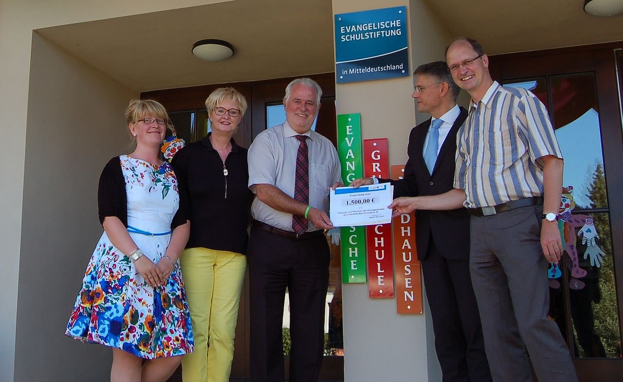 Nach dem offiziellen Festakt kam Jürgen Reinholz, Thüringer Minister für Landwirtschaft, Forst, Umwelt und Naturschutz überreichte einen Förderbescheid in Höhe von 1.500 Euro an den Fördervereinsvorsitzenden der Evangelischen Grundschule, Dr. Ibe, den Vorstandsvorsitzenden der Evangelischen Schulstiftung in Mitteldeutschland, Marco Eberl, Landtagsabgeordnete Evelin Groß und Schulleiterin Lysann Voigt-Huhnstock.