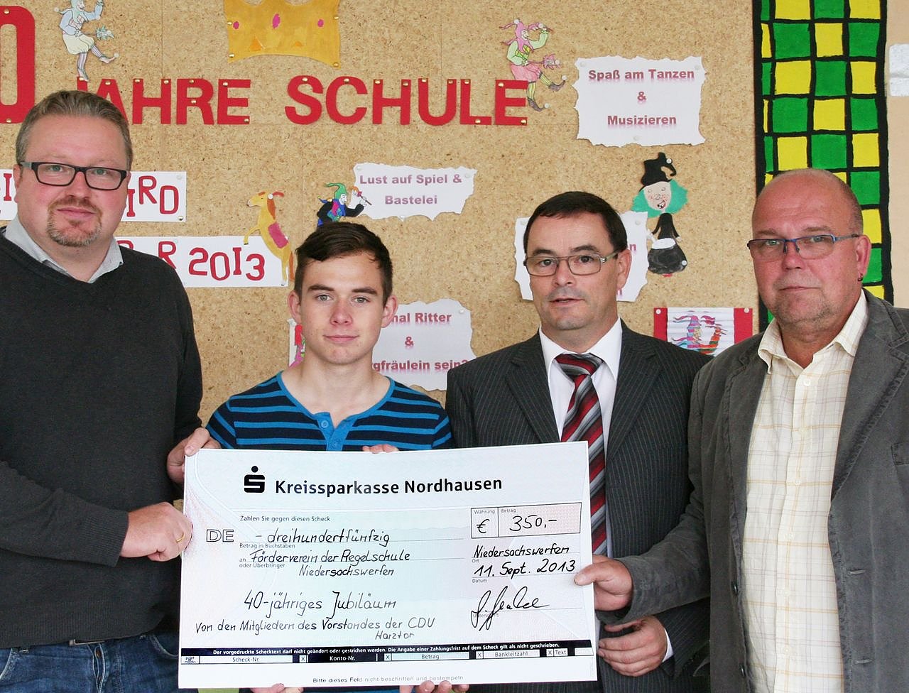 Autor: redDer Vorstand der CDU-Harztor spendete 350 Euro für die Festlichkeiten zum 40-Jährigem Jubiläum (vlnr.): Sebastian Gerecke (CDU-Vorstand), Lucian Lehner-Sachse (Schülersprecher), Hans-Peter Köthe (Schulleiter), Wolfgang Rothgaenger (Förderverein)