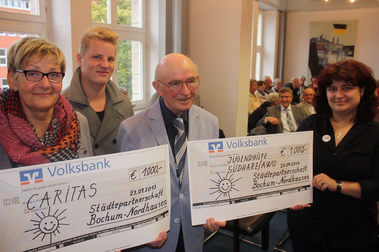 Der Vorsitzende des Partnerschaftsvereins Bochum-Nordhausen, Paul Schrader (Mitte) überreicht Brigitte Wildt von der Tauschbörse der Caritas (links), und Jana Kowitz (rechts) sowie Manuel Reichardt von der AWO Südharz die symbolischen Schecks.
