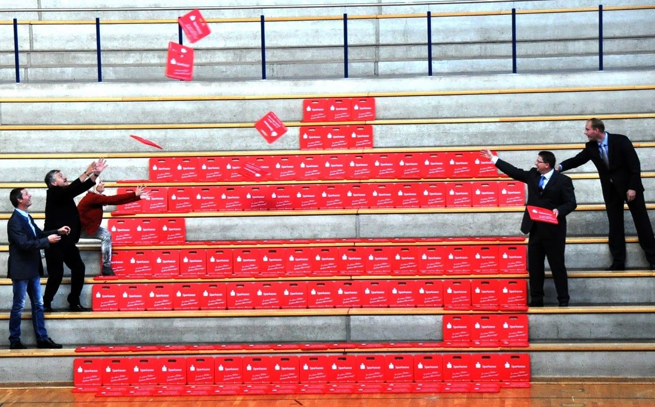 Autor: redThomas Seeber, Vorstandsmitglied der Kreissparkasse Nordhausen und Sebastian Gräser, Leiter Vorstandssekretariat übergaben gestern an den Kreissportbund Nordhausen 2.500 Sitzkissen. Diese können in Zukunft bei Großveranstaltungen in der Wiedigsburghalle gegen eine geringe Gebühr ausgeliehen werden.