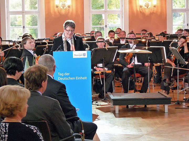 Auf den Tag der Einheit eingehend sagte sie, "wir haben allen Grund zum Feiern". Der 3. Oktober steht dafür, in Freiheit die Zukunft zu gestalten. Sie stellte fest, Thüringen steht gut da, aber wir stehen vor großen Herausforderungen in Europa und dem demografischen Wandel. Bei der Arbeitslosigkeit haben wir mit 7,6 Prozent gut aufgeholt und stehen nur noch 0,3 Prozent hinter Hamburg. Weiter sagte sie, Thüringens Zukunft liegt in Europa und der Welt. Die deutsche Einheit gelang auch dank Polens und erhielt hierzu viel Beifall, und leitet damit zum Festredner Janusz Reiter, Botschafter a. D. der Republik Polen, über.