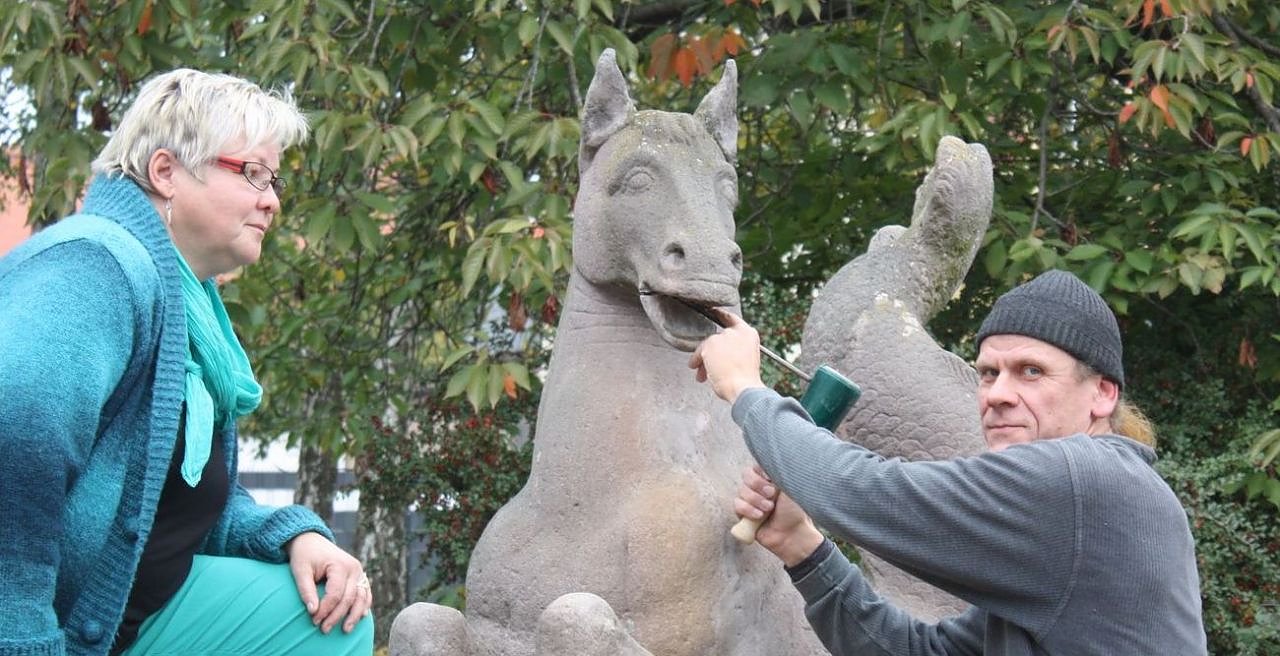 Thomas Osius, Bau- und Denkmalpfleger sowie Restaurateur (im Bild mit Sabine Dautz, der Brunnen- und Spielplatzverantwortlichen der Stadtverwaltung), hat jetzt den defekten Unterkiefer entnommen, wird ihn reinigen und aufarbeiten. Spätestens im Frühling soll die Skulptur wieder vervollständigt werden.
