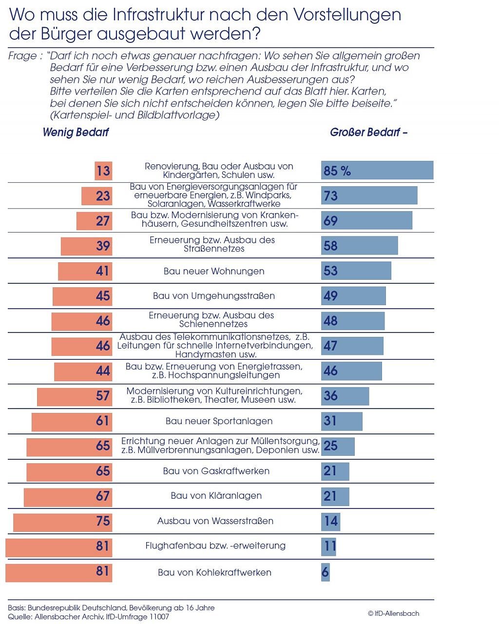 Beim Bau von Umgehungsstraßen, der Erneuerung bzw. dem Ausbau des Schienennetzes sowie des Telekommunikationsnetzes, ebenso wie beim Bau und der Erneuerung von Energietrassen, wird nur noch von knapp jedem zweiten Bürger ein Investitionsbedarf gesehen. In Bezug auf die Maßnahmen im energetischen Infrastruktur ist auffallend, dass zwar die überwältigende Mehrheit den Bau von Energieversorgungsanlagen für erneuerbare Energien für erforderlich hält, aber deutlich weniger, nämlich 46 Prozent der Bevölkerung,