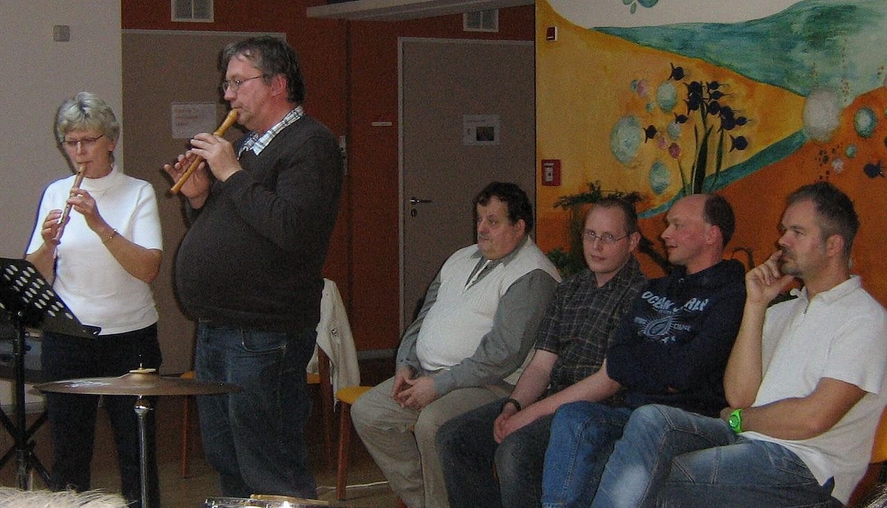 Es spielten unter der Leitung von Christel Laude: Stephan Piontek, Horst Enders, Maik Bachmann, Nick Remde und Peter Görlach auf unterschiedlichen Instrumenten - von der Trompete, Flöte, Gitarre, Keyboard bis zum Schlagzeug. Die Bewohnerinnen und Bewohner sangen oder summten bekannte Melodien mit.