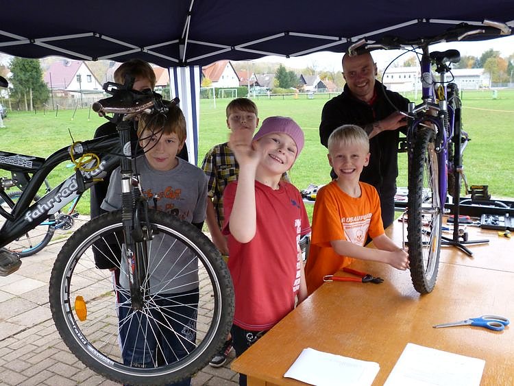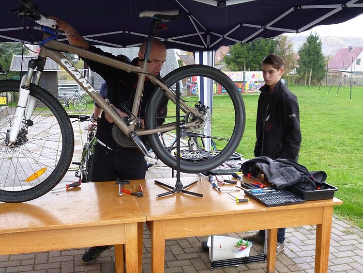 Am vergangenen Freitag fand im Jugendcentrum in Niedersachswerfen in der Bahnhofstraße ein Fahrradworkshop statt. Trotz des Nieselregens kamen einige junge Menschen, um gemeinsam mit Heiko Hieronymus (Jugendgruppenleiter) ihre Fahrräder fahrtauglich zu machen. Geschützt unter einem Pavillon wurde geschraubt und getüftelt. Als zusätzliches Angebot hielt Herr Schmidt einen interessanten Vortrag zum Thema Verkehrssicherheit.