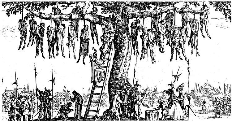 Die Gehenkten", Jacques Callot, aus der Serie "Schrecken und Jammer des Krieges", 1633