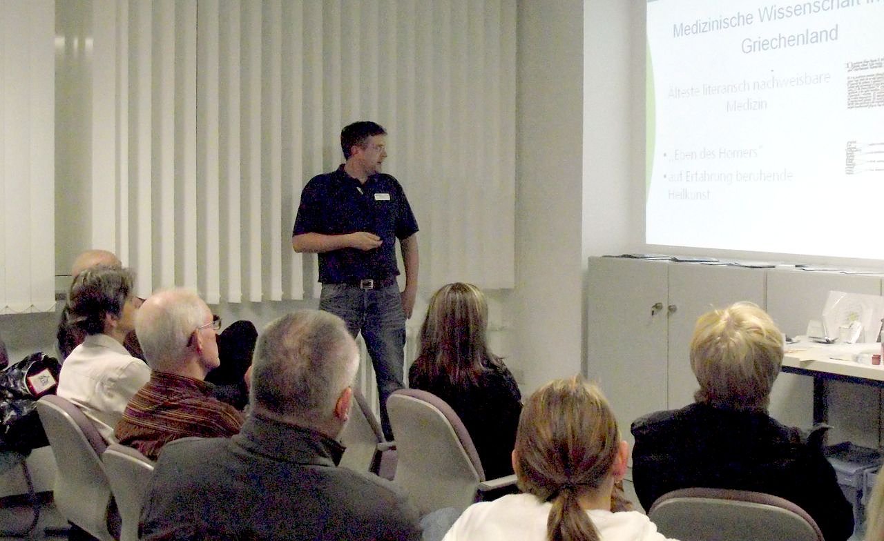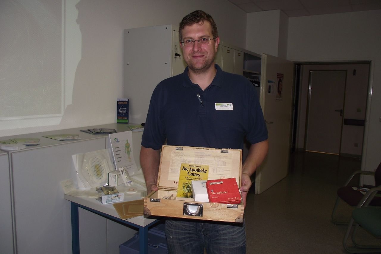 Nicht minder interessant war das, was Mario Gießler, Pflegetherapeut im Klinikum, zu sagen wusste. Er beschäftigte sich mit der Wundversorgung im Wandel der Zeit – von der Steinzeit bis heute. Sie sei so alt wie die Menschheit. Mit dem Wundenlecken habe es begonnen. Später zerkaute man Blätter, um deren ätherische Öle wirken zu lassen. Vor 4000 Jahren unterschieden ägyptische Ärzte schon zwischen sterilen und infizieren Wunden. Die alten Römer kannten schon feuchte Verbände und Schwämme.