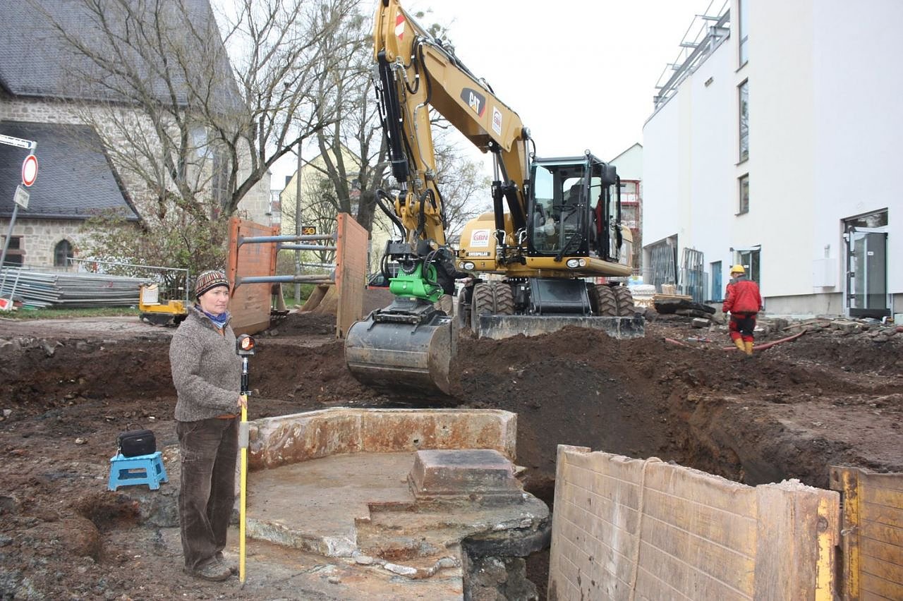 Autor: redSybille Jan vom Landesamt für Archäologie bei den Vermessungsarbeiten für das Brunnenfragment.