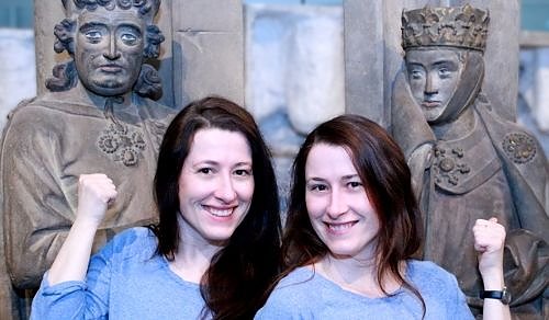Die Autorinnen Claudia und Nadja Beinert vor den Stifterfiguren Ekkehard und Uta am Naumburger Dom