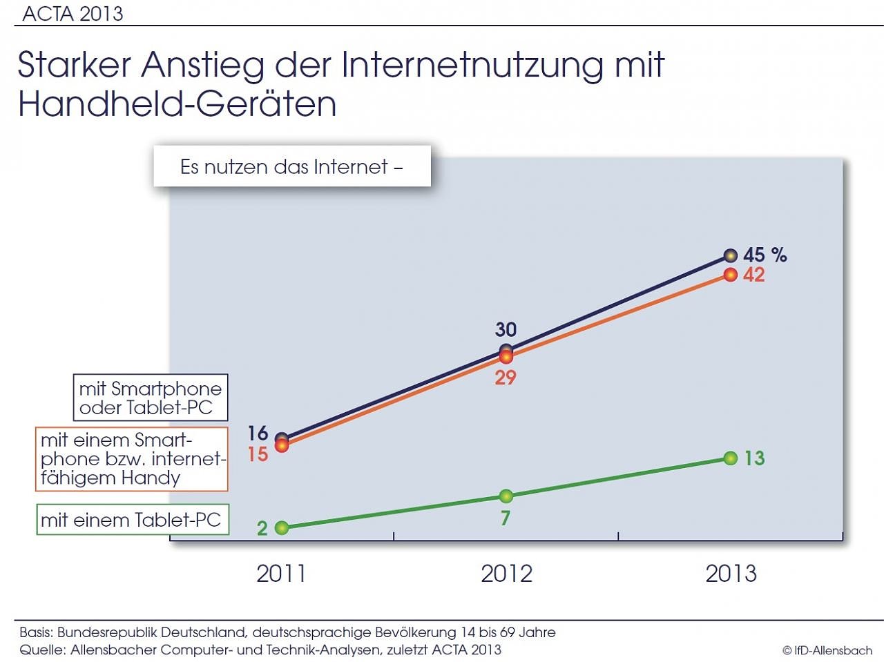 Seit 1997 ermittelt die jährlich erscheinende Allensbacher Computer- und Technik-Analyse (ACTA) Akzeptanz und Nutzung digitaler Techniken sowie die Veränderung des Informations-, Kommunikations- und Transaktionsverhaltens der Bevölkerung. Sie ist eine der größten bevölkerungsrepräsentativen Umfragen in Deutschland und stützt sich auf rund 8.700 ausführliche persönlich-mündliche Interviews. Vergangene Woche wurden die aktuellen Ergebnisse veröffentlicht.