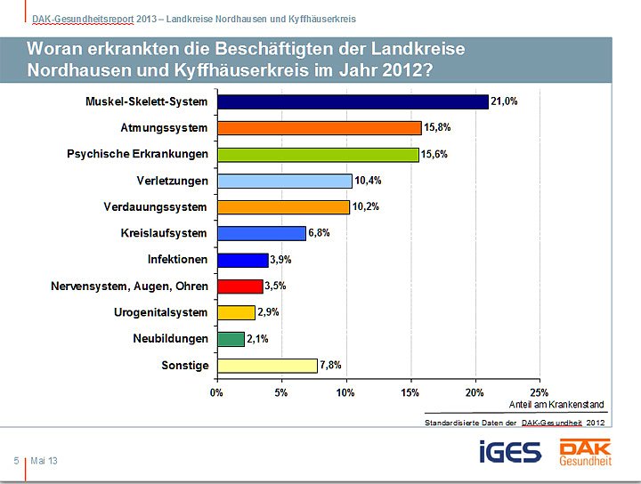 Mit 4,8 Prozent hatte die Region aber einen höheren Krankenstand als der Landesdurchschnitt (4,6 Prozent). Damit waren an jedem Tag des Jahres von 1.000 DAK-versicherten Arbeitnehmern 48 krankgeschrieben. Der niedrigste Wert in Thüringen wurde mit 4,0 Prozent in der Stadt Jena verzeichnet, der höchste mit 5,1 Prozent in der Stadt Gera.