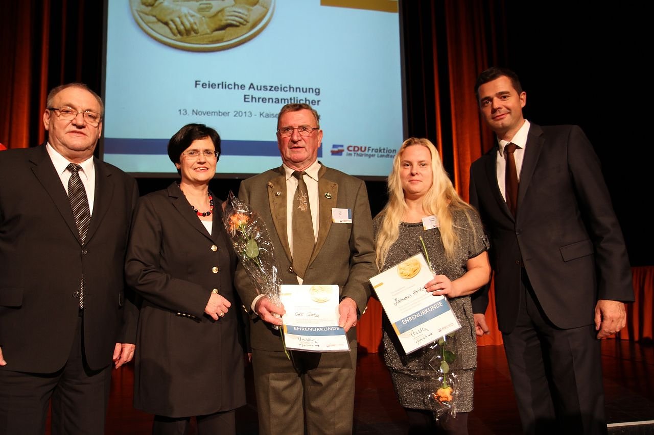 75 Thüringerinnen und Thüringer nahmen ihre Auszeichnung im Erfurter Kaisersaal entgegen. Für ihr ehrenamtliches Engagement wurden Ramona Hoidn (Bleicherode) und Otto Ibe (Neustadt) ausgezeichnet. Der CDU-Landtagsabgeordnete Egon Primas hatte beide für die diesjährige Ehrung vorgeschlagen.