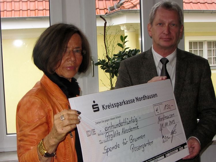 Die bekennende Nordhäuserin und pro vita-Chefin Uta Triebel feierte vor kurzem ihr 50-jähriges Dienstjubiläum und löste heute ihr Versprechen ein, erhaltene Geldgeschenke einem guten Zweck zuzuführen. Der Erhalt Nordhäuser Traditionen, wie der Rosenbrunnen eine darstellt, liegt Uta Triebel am Herzen. Mit ihren 150,- Euro ist die Spendensumme nun auf 1.500 Euro angewachsen und Ulrich Henne, der die Lions-Hilfe anführt, ist optimistisch, im nächsten Jahr den Brunnen in alter Schönheit präsentieren zu können.