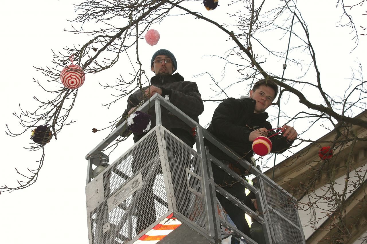 Für den weihnachtlichen Schmuck sorgt in diesem Jahr die Nordhäuser Jugendkunstschule mit Unterstützung vieler Nordhäuser Vereine. Heute haben Jens Fröhlich, Dozent an der Jugendkunstschule (links auf der großen Feuerwehrdrehleiter), und Max-Paul Kais vom städtischen Kulturamt (rechts) mit bunten Woll-Bommeln die Tannen und die große Buche auf dem Theaterplatz weihnachtlich geschmückt.